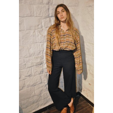 Pantalons tipus seventies de tir alt, cama ampla i llarg al turmell. Tancament amb botó i cremallera. Teixit gruixut marí 100% llana.